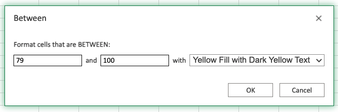 Now, the cells with values between "79" and "100" will be highlighted in yellow: