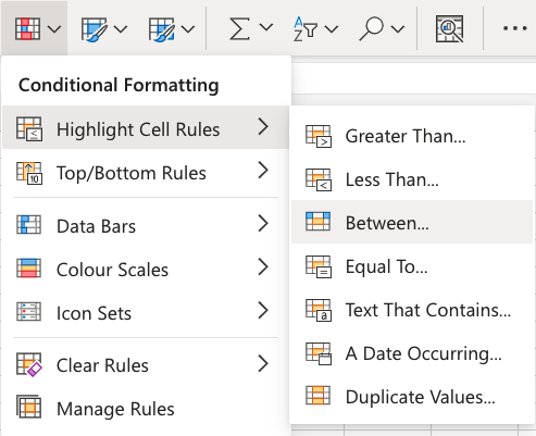 Here is the Highlight Cell Rules part of the conditional formatting menu: