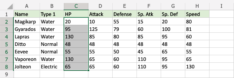 Gyarados, Lapras and Vaporeon have HP values greater than 65, so they are hightlighted.