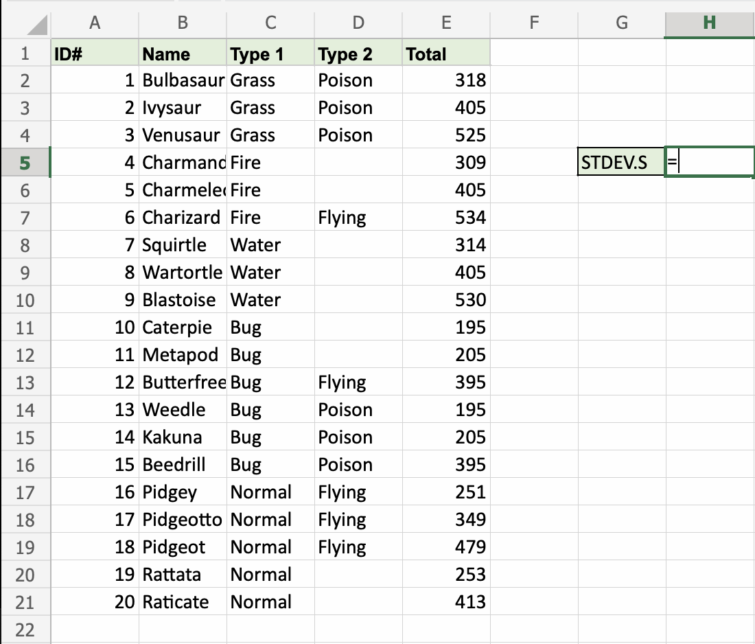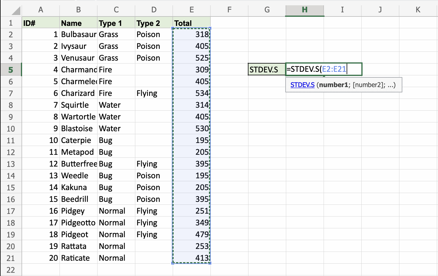 That's the way! The STDEV.S function has successfully returned the Standard Deviation 113,2319 for the sample of Pokemons Total stats.